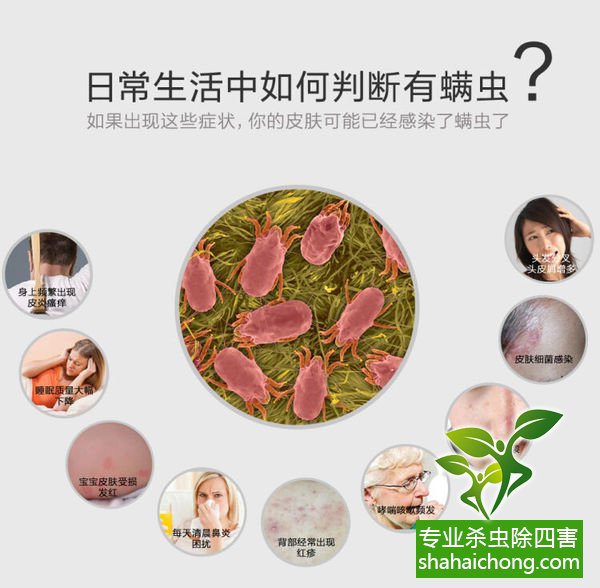 專業除螨公司提示塵螨雖然肉眼看不見,但幾乎存在于我們家中的各個角落,比如枕頭、被子、床墊、沙發、床底下、地毯(一般是以棉、麻或化學合成纖維制作)、角落死角、空調濾網等等,主要以皮屑、粉末、霉菌(fungus)為食。除螨蟲現發現螨蟲與人的健康關系非常密切,諸如革螨、恙螨、疥螨、蠕螨、粉螨、塵螨和蒲螨等可叮人吸血、侵害皮膚,引起“酒糟鼻”或蠕螨癥、過敏癥、尿路螨癥、肺螨癥、腸螨癥和疥瘡,嚴重危害人類的身體健康。